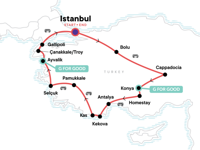 Your Local Living Moment: Turkish Village Homestay, Güneysınır. Istanbul city walking tour. Visit to the Göreme Open Air Museum. Underground city exploration. Afternoon boat trip (Mediterranean sea, weather permitting). Ancient Hierapolis and Pamukkale entrance and guided walk. Ephesus entrance and visit. Troy entrance and guided visit. Gallipoli battlefields entrance and guided visit. All transport between destinations and to/from included activities.
