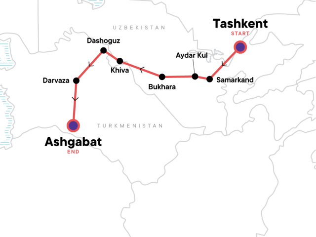 Bargain your way through traditional bazaars, Stay overnight in a local yurt camp, Visit the desert community of Erbent, Marvel at the Darvaza crater (known as the "Door to Hell"), See the city treasures of Ashgabat