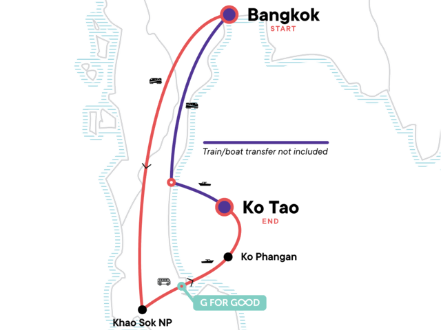 Your Big Night Out Moment: Beach Bar, Ko Tao. Street food crawl. Lake Cheow Larn excursion. Snorkelling trip (Ko Tao). Beach time on Thai islands. All transport between destinations and to/from included activities.