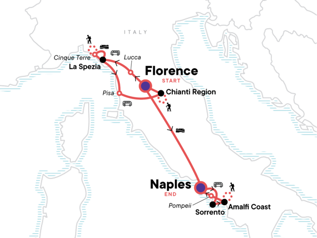 Walk along the dramatic scenery of Cinque Terre, xplore medieval towns and stroll through vineyards, pend two nights in the Tuscan countryside while eating fresh and delicious regional food, Hike the "Path of the Gods" on the Amalfi Coast.