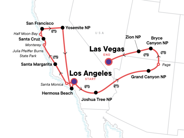 Your Welcome Moment: Welcome Moment - Meet Your CEO and Group. Stops in Santa Monica and San Luis Obispo. Visit to see the Elephant Seals. Hike in Julia Pfeiffer Burns State Park. San Francisco orientation tour. Yosemite National Park visit. Surf lesson in southern California. Visit to Joshua Tree National Park. Drive along Route 66. Hike in Grand Canyon National Park. Visit to Horseshoe Bend. Bryce Canyon National Park visit. Zion National Park visit. Entrance fees to all national parks and monuments with hiking and walking excursions. Self-inflating mattresses and dome tents. All transport between destinations and to/from included activities.